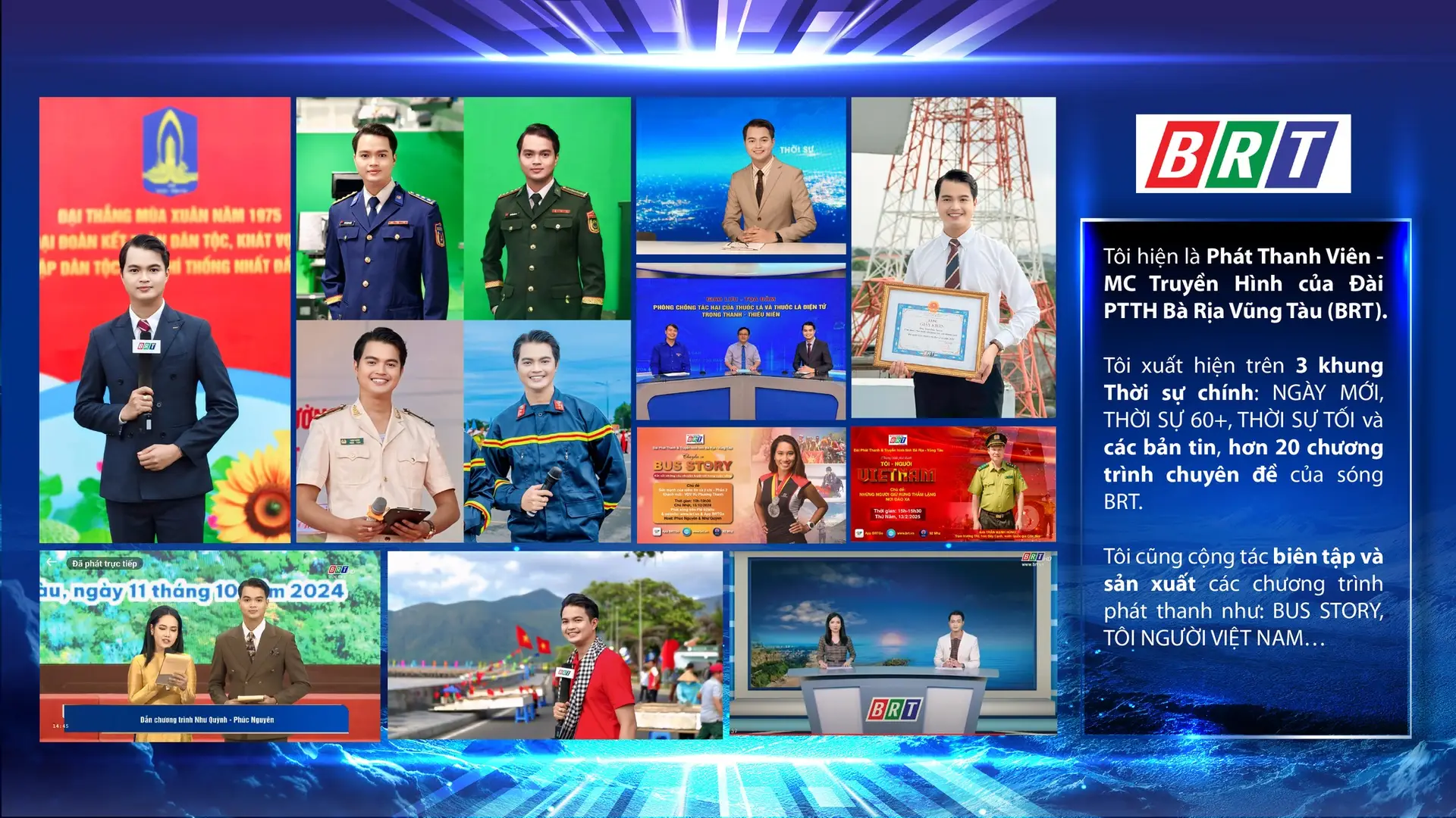 Sinh năm 1995, cao 1m81 – nặng 75kg, tôi là MC song ngữ Anh - Việt chuyên nghiệp, hiện công tác tại Đài Phát thanh - Truyền hình Bà Rịa - Vũng Tàu (BRT) với vai trò MC, phát thanh viên và biên tập chương trình phát thanh. Với phong cách dẫn linh hoạt, duyên dáng và giàu cảm xúc, tôi đã để lại dấu ấn trong nhiều chương trình truyền hình, hội nghị, sự kiện song ngữ và tiệc cưới chuyên nghiệp.